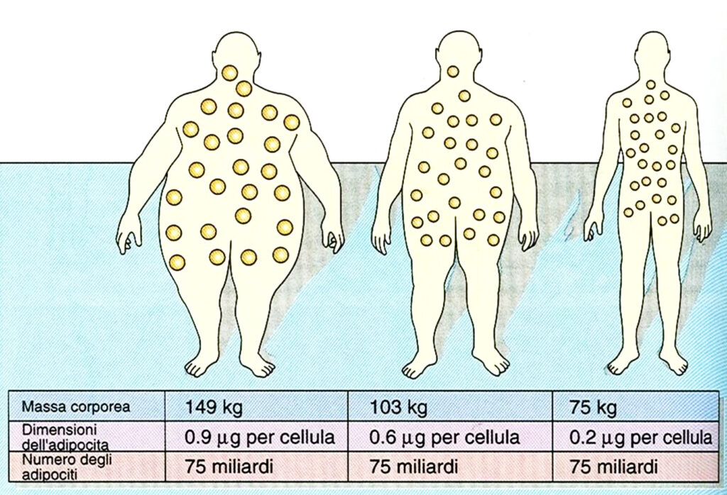 In una fase iniziale, quando iniziamo a ingrassare, si verifica un aumento delle dimensioni dell’adipocita (ipertrofia). Esiste però un limite oltre il quale gli adipociti non possono ulteriormente aumentare di volume (volume massimo = 1µg), quindi un ulteriore incremento delle riserve adipose è realizzabile soltanto attraverso l’aumento del numero di adipociti (iperplasia).